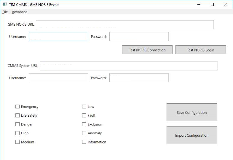 6. In the menu at the top of the window, select the Advanced page and configure the event manager network settings for the TJM CMMS data queries: