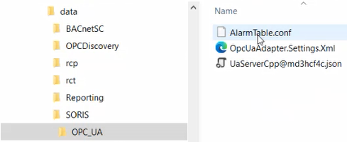 When an OPC UA adapter is started, in C:\Program Files (x86)\Siemens\SORIS OPC UA Adapter, the Configurations folder is created, which includes the AlarmTable.conf file and any other files that allow connecting to the OPC UA servers.