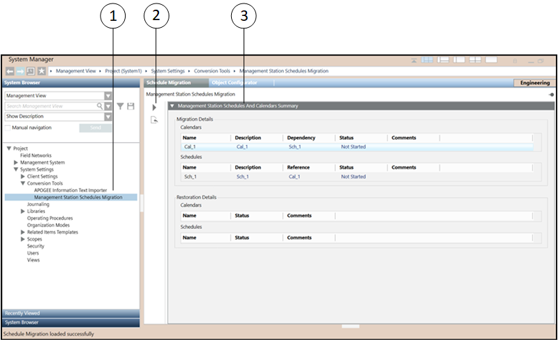 Displays the list of Schedule and Calendar objects that you want to migrate/restore.