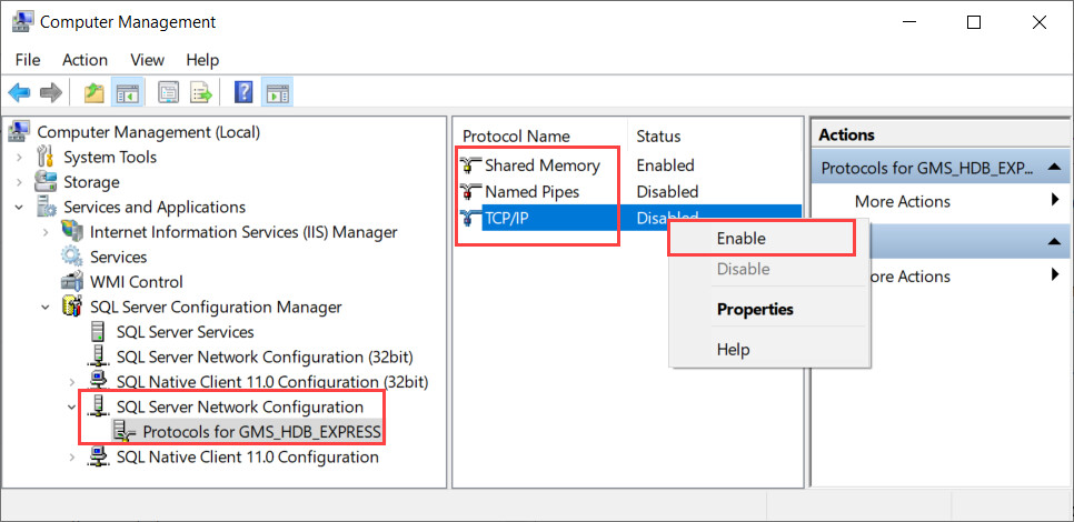 - Navigate to Services and Applications > SQL Server Configuration Manager > SQL Server Network Configuration > Protocol for [SQL name].