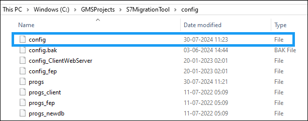 3. Open Project config in notepad. This file is present at either of the following locations, \GMSProjects\<ProjectName>\config\config or <ProjectPath>\config\config. For example, in the following image, the config file is located at C:\GMSProjects\S7MigrationTool\Config.